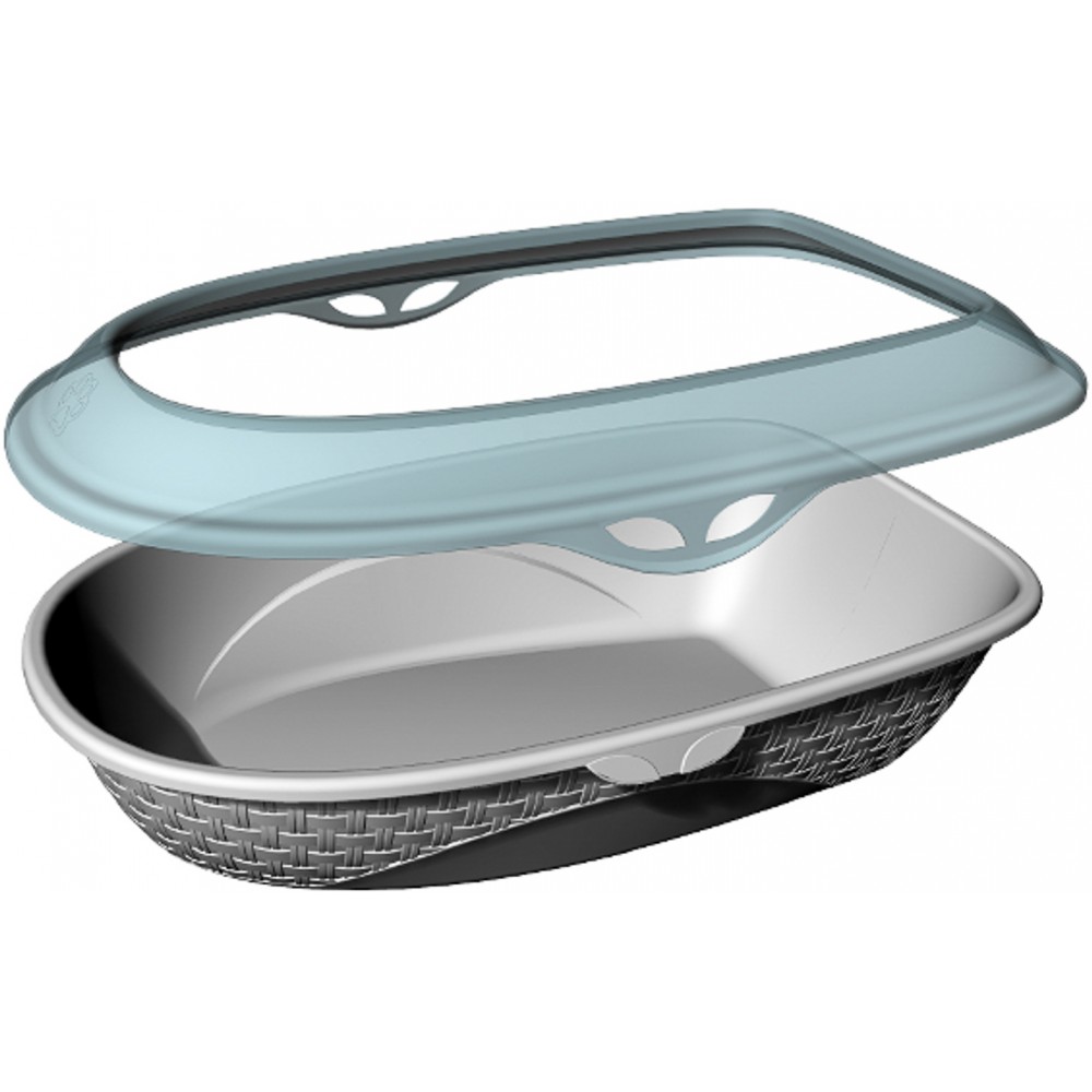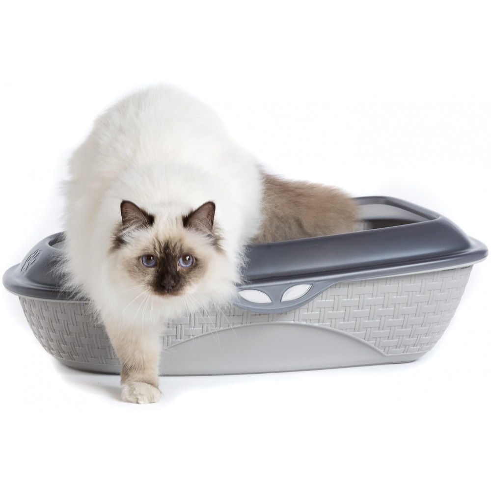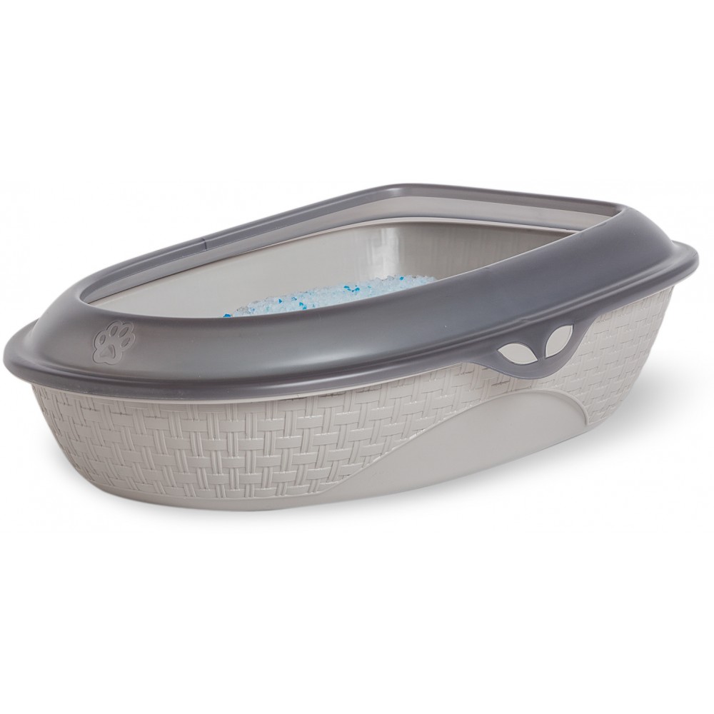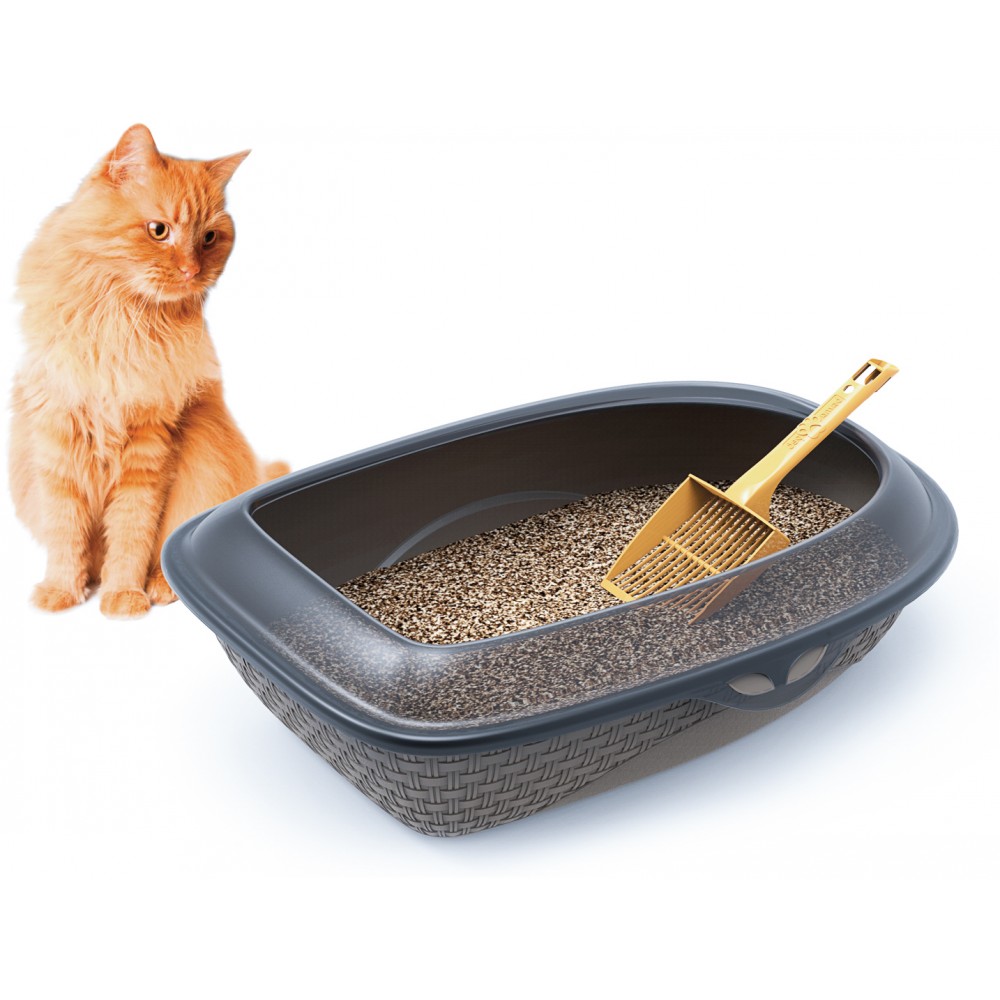 Удобные бортики препятствуют разбрасыванию наполнителя, а удобная форма позволяет компактно разместить его в доме