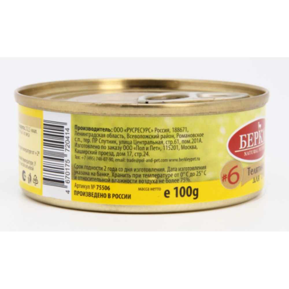 Полнорационное консервированное питание из телятины для собак и щенков с 3-х месячного возраста