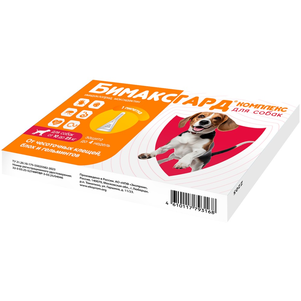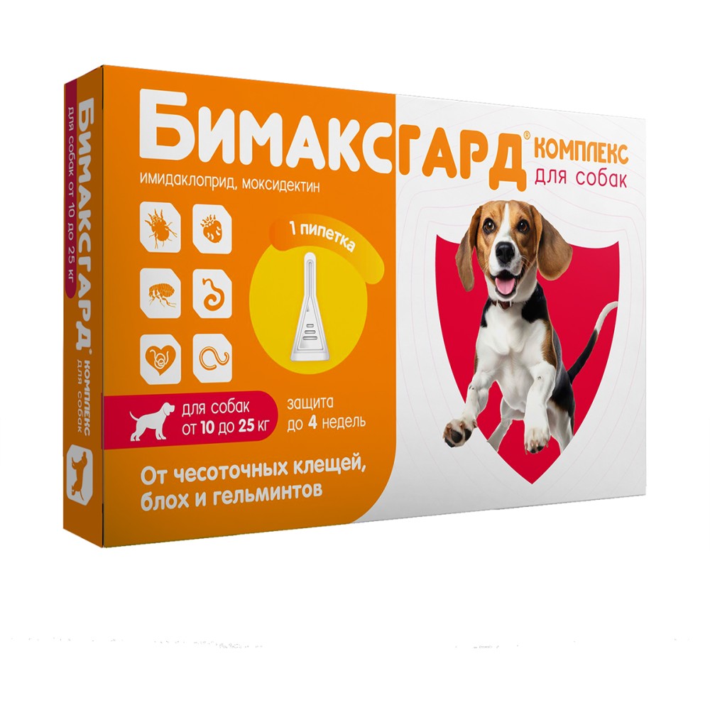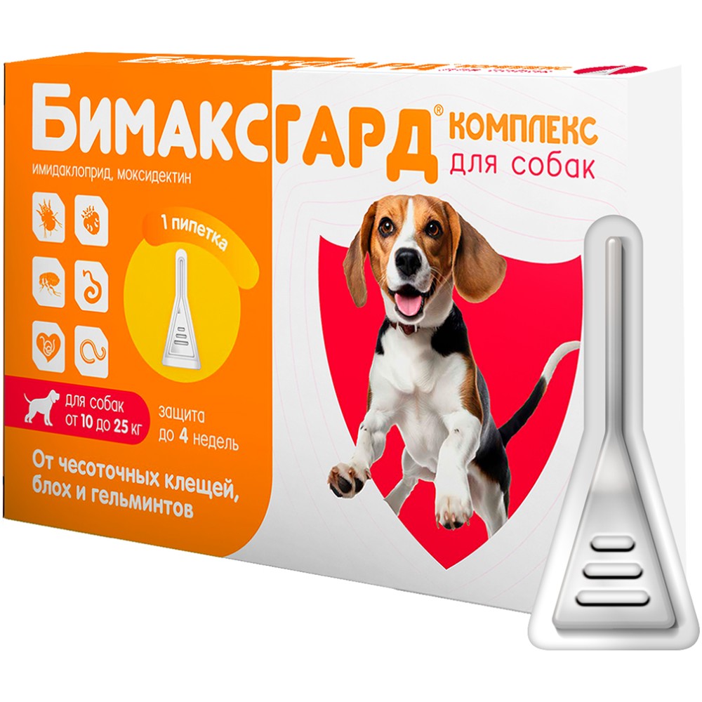 Бимаксгард® Комплекс для собак 10-25 кг - современный комбинированный противопаразитарный препарат. Эффективен от чесоточных клещей, блох и гельминтов.