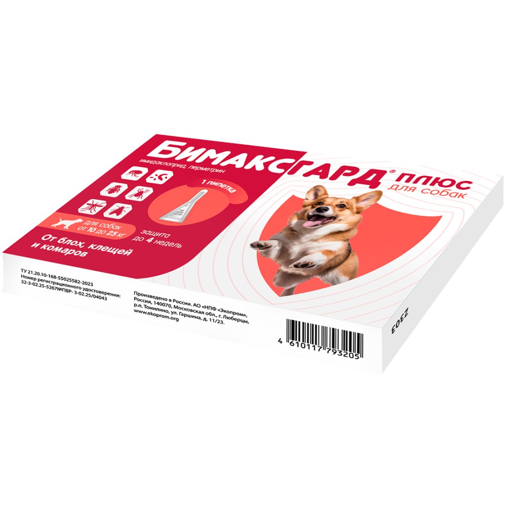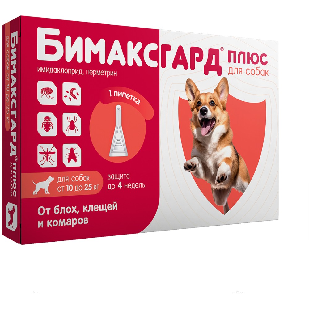 Бимаксгард® Плюс для собак 10-25 кг - современный противопаразитарный препарат. Оказывает выраженное инсектицидное, акарицидное и репеллентное действие.