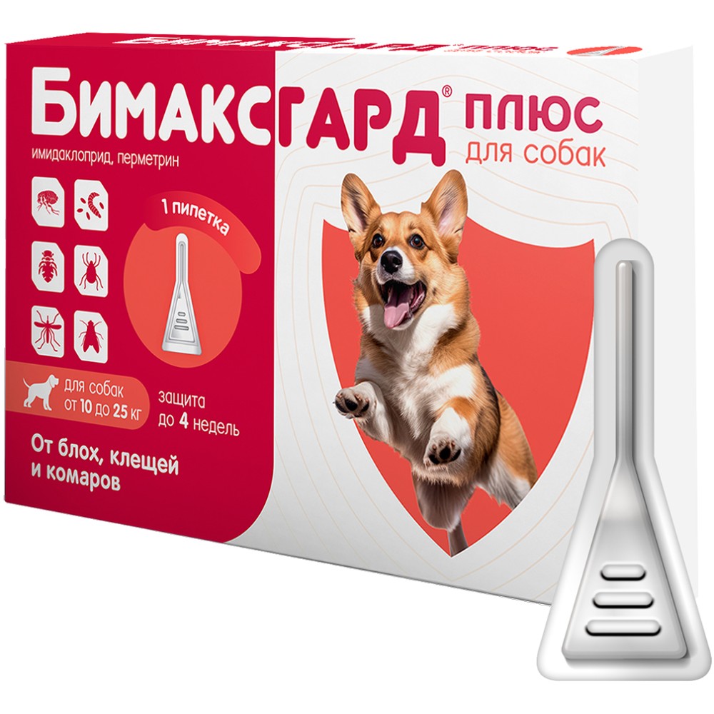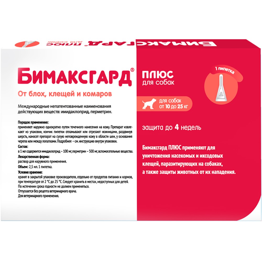 Бимаксгард® Плюс для собак 10-25 кг относится к фармакотерапевтической группе инсектоакарицидные средства в комбинациях.