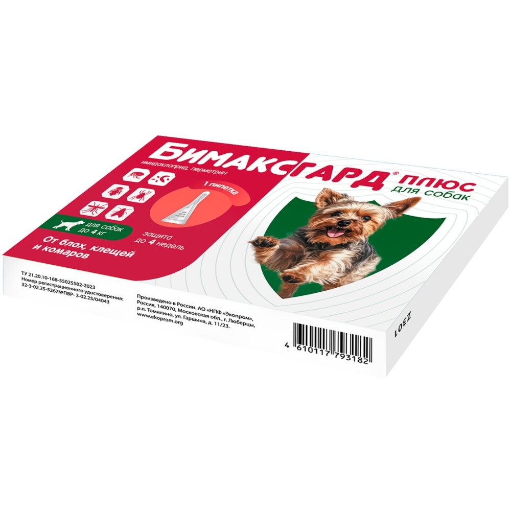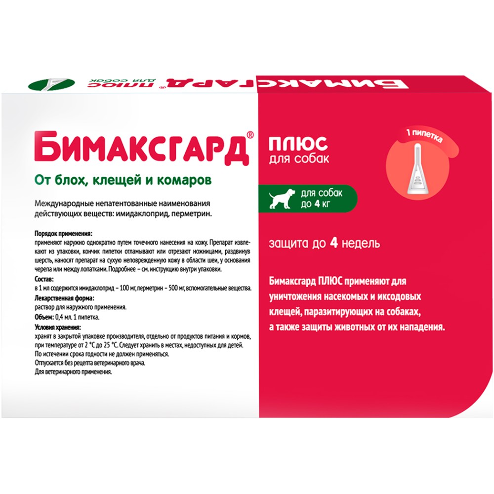 Бимаксгард® Плюс для собак до 4 кг - современный противопаразитарный препарат. Оказывает выраженное инсектицидное, акарицидное и репеллентное действие.