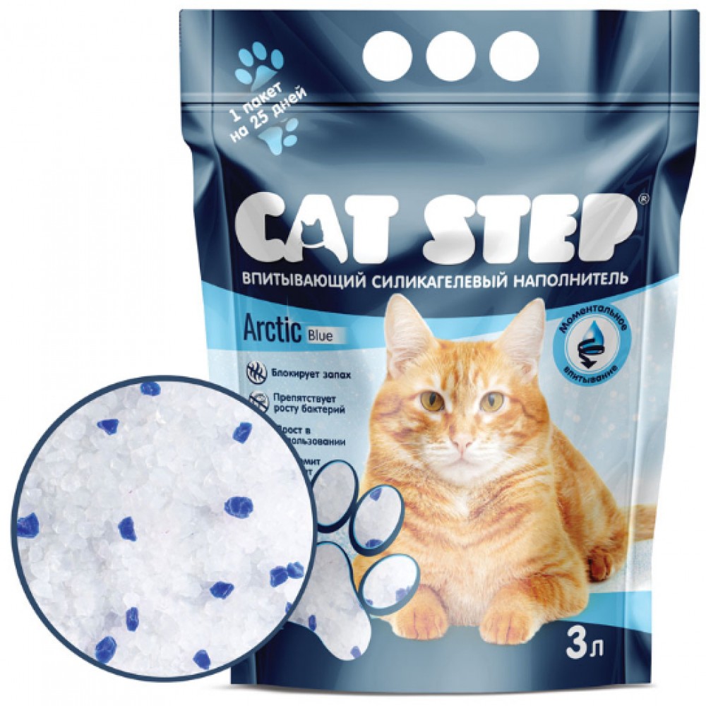 Силикагелевый наполнитель для кошачьего туалета CAT STEP Arctic Blue с цветными синими гранулами моментально впитывает влагу и уничтожает запахи.