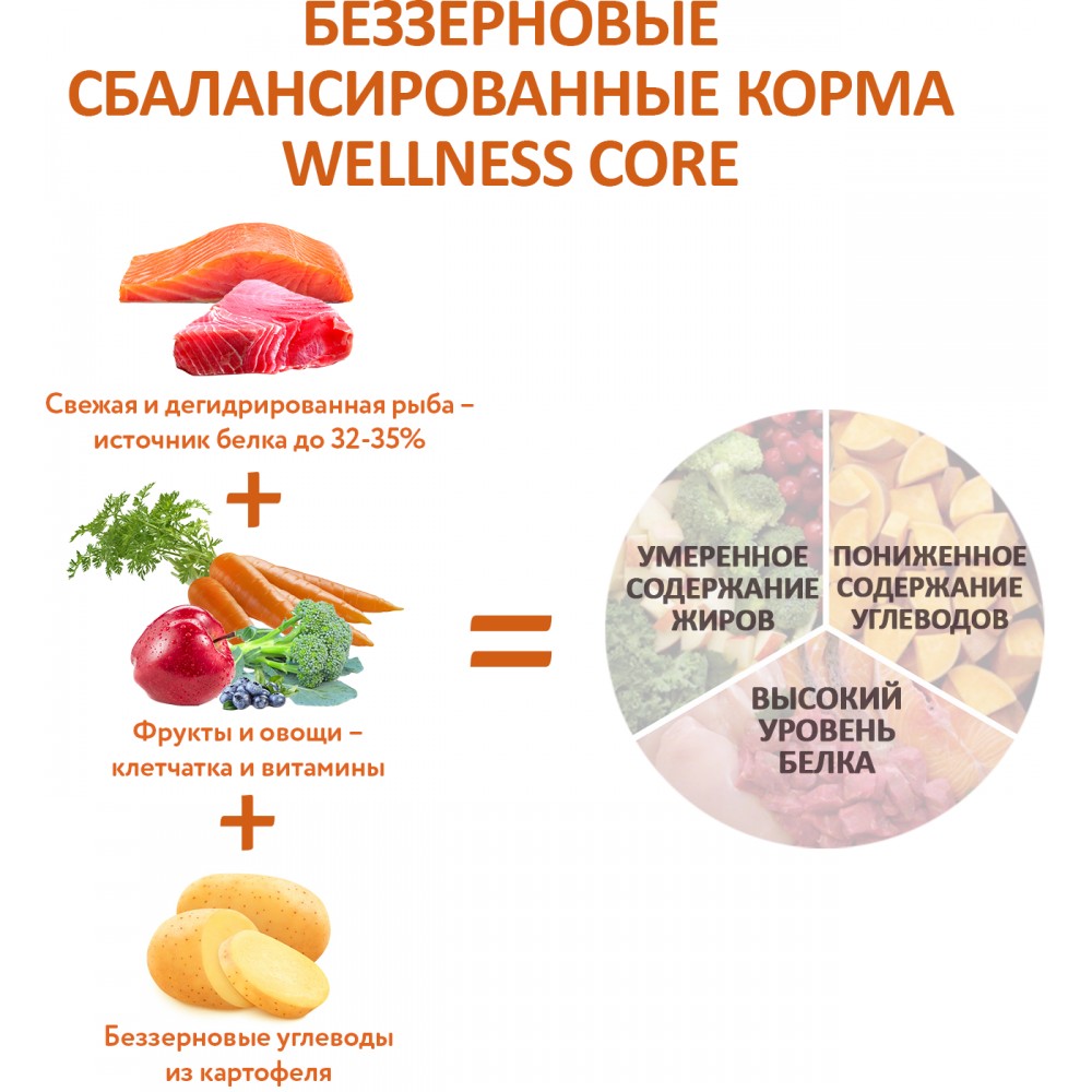 Wellness CORE —полнорационный беззерновой корм класса холистик, который создан с учётом естественных потребностей домашних любимцев, которые являются хищниками по своей природе.
