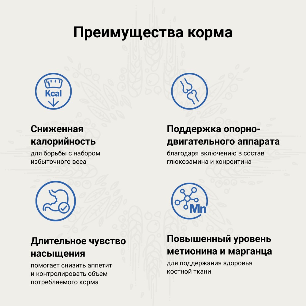 Состав корма отличается сниженным содержанием жира и низкой энергетической ценностью, идеален для снижения и профилактики набора избыточного веса.