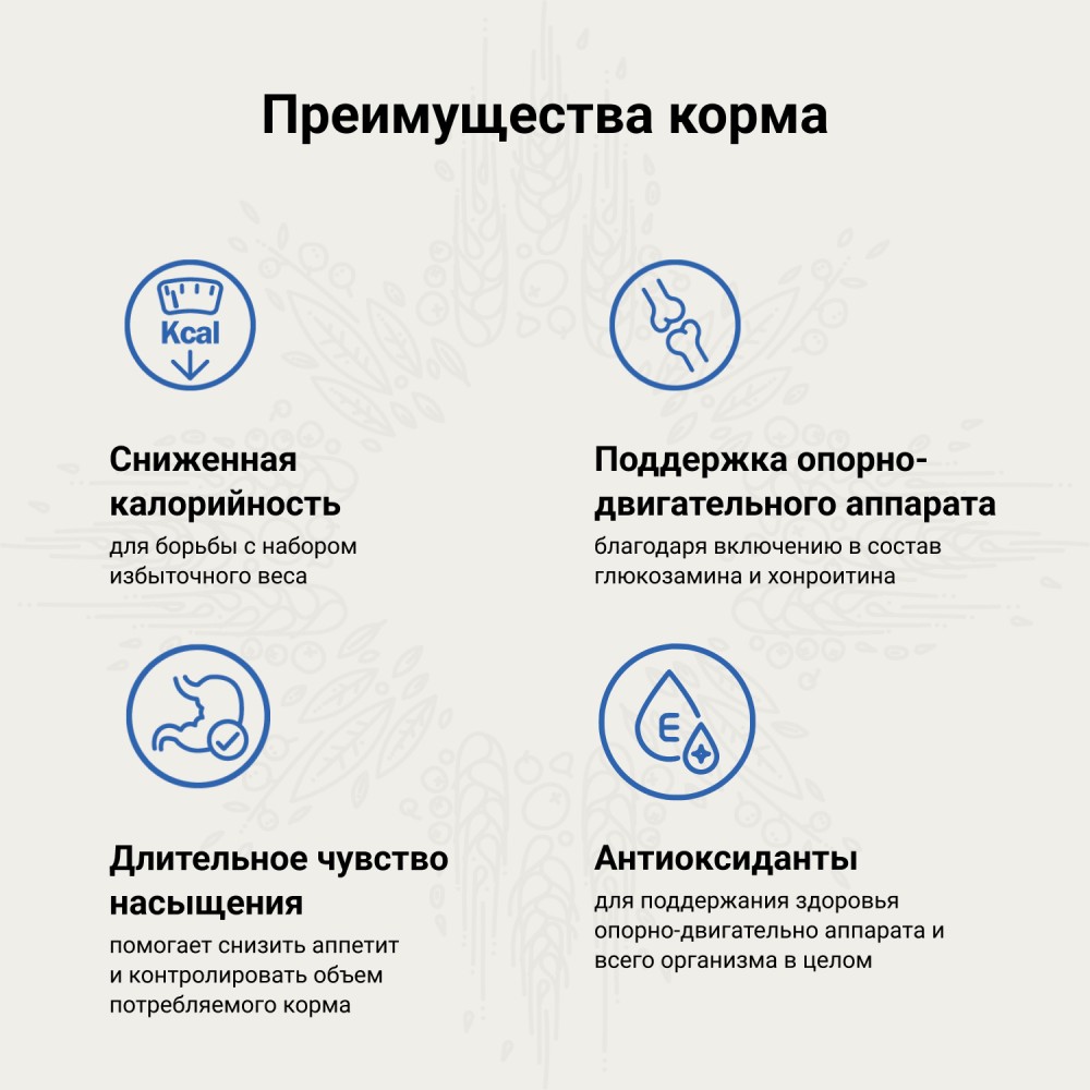 Состав корма отличается сниженным содержанием жира и в сочетании с режимом питания, помогают снизить лишний вес и уменьшить нагрузку на пораженные суставы.