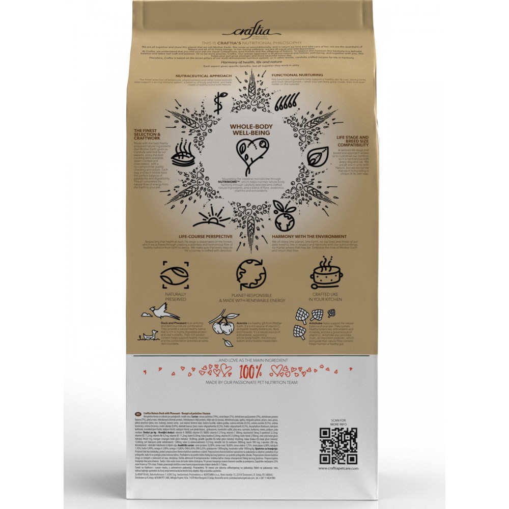 Состав кормов CRAFTIA прозрачен и понятен, отсутствуют скрытые добавки и сомнительные ингредиенты.