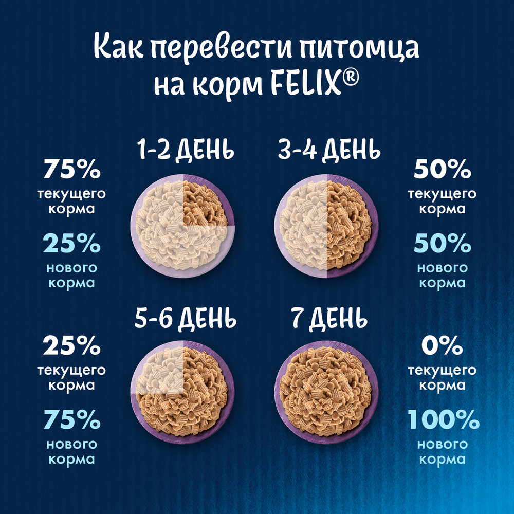Вводите корм FELIX® Двойная вкуснятина® с говядиной постепенно в течение 7 дней.