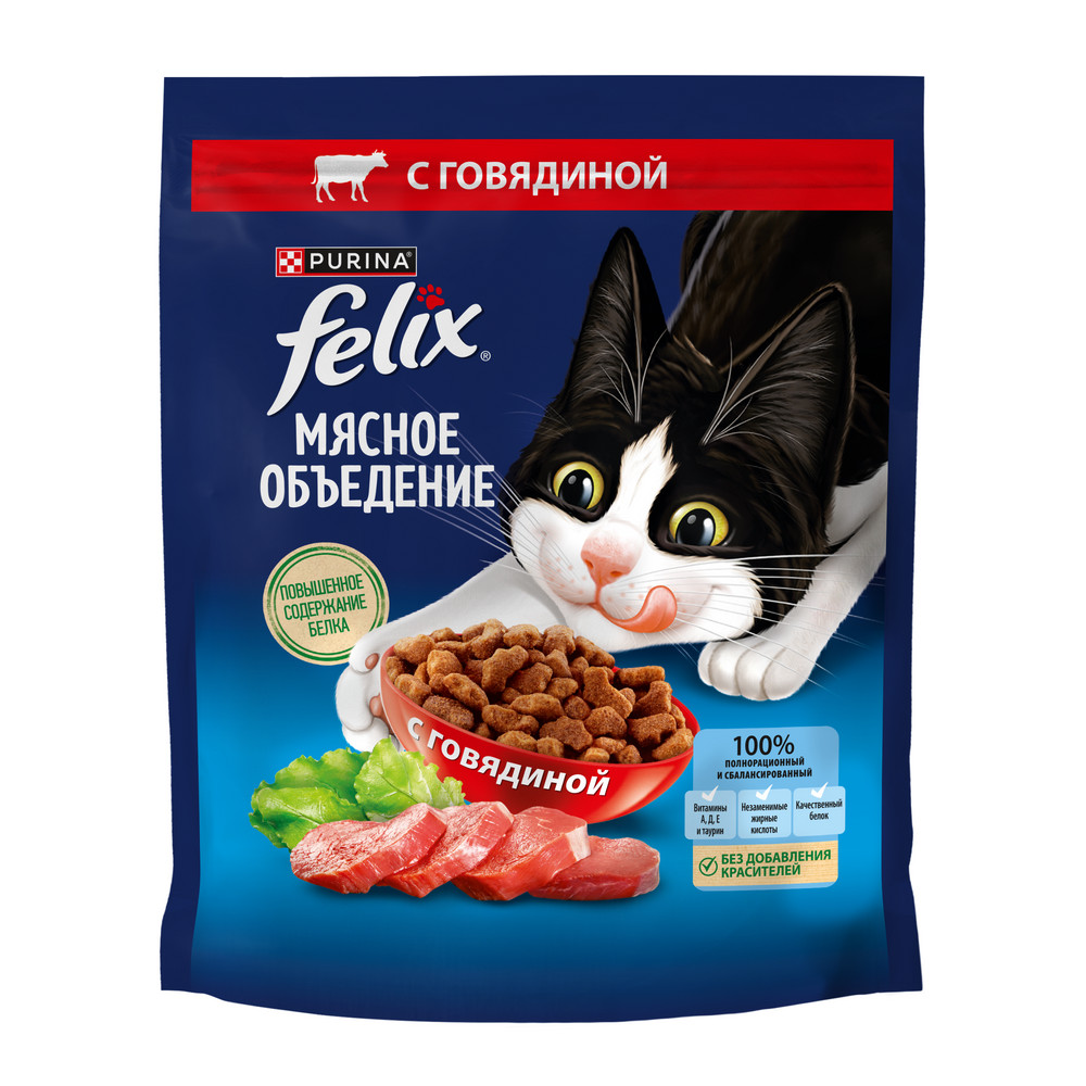 Сухой корм для кошек FELIX® Мясное объедение — это микс аппетитных хрустящих гранул с повышенным содержанием белка с насыщенным мясным вкусом.