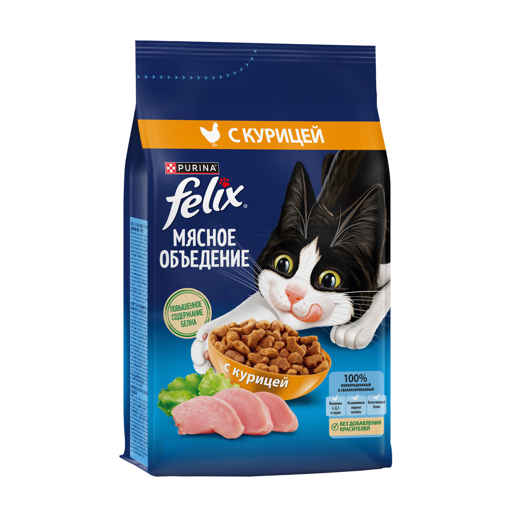 Корм FELIX® МЯСНОЕ ОБЪЕДЕНИЕ – это микс хрустящих гранул естественной формы с повышенным содержанием белка, созданный, чтобы побаловать Вашего кота всей полнотой мясного вкуса, которую он заслуживает.