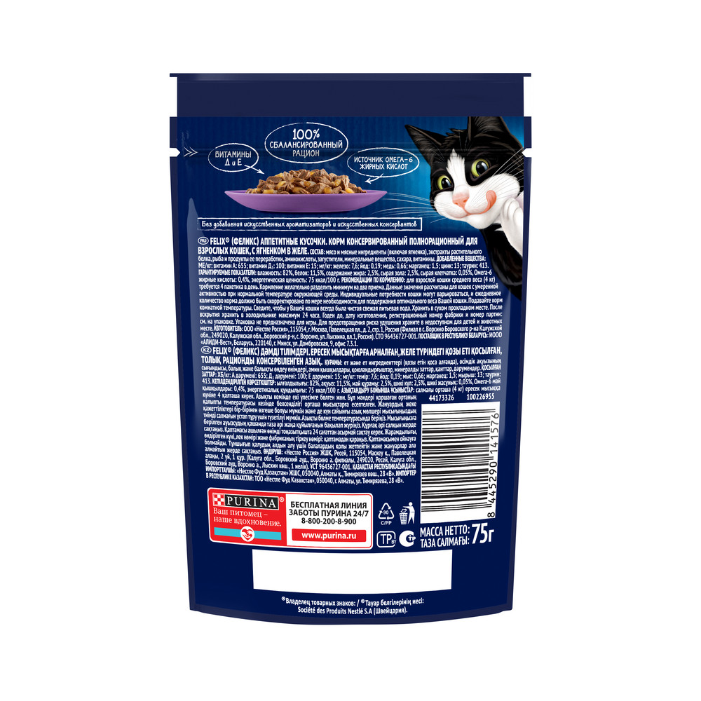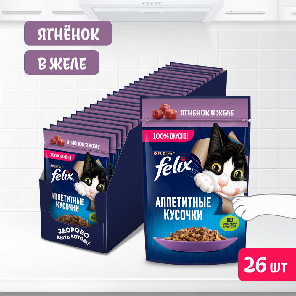 Влажный корм для кошек Felix Аппетитные кусочки — полнорационный, содержит все необходимое для здоровой активной долгой жизни.