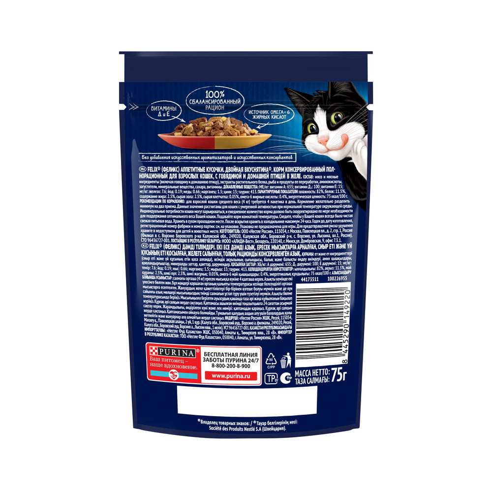 Эксперты Purina создали Felix Аппетитные кусочки Двойная Вкуснятина - невероятно вкусный влажный корм для взрослых кошек, сочетающий в себе сочные кусочки двух разных вкусов в аппетитном желе.