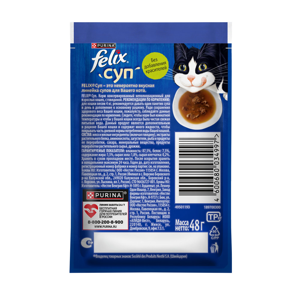 • Корм для кошек Felix не содержит искусственных красителей, ароматизаторов и консервантов.