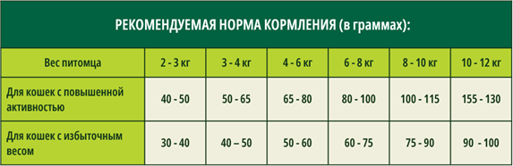Указанные количества являются ориентировочными и могут отличаться от приведенных в таблице в зависимости от возраста, размера кошки и уровня ее физической активности.
