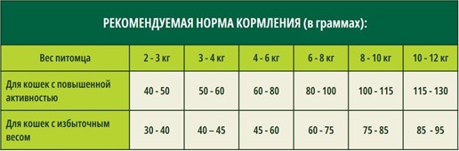 Указанные количества являются ориентировочными и могут отличаться от приведенных в таблице в зависимости от возраста, размера кошки и уровня ее физической активности.