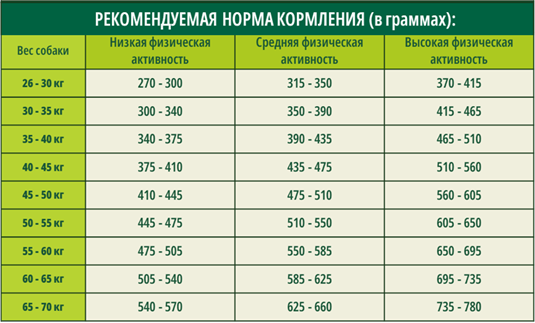 Указанные количества являются ориентировочными и могут отличаться от приведенных в таблице в зависимости от возраста, размера собаки и уровня ее физической активности.