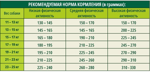 Указанные количества являются ориентировочными и могут отличаться от приведенных в таблице в зависимости от возраста, размера собаки и уровня ее физической активности.