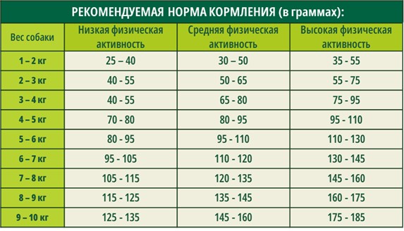 Указанные количества являются ориентировочными и могут отличаться от приведенных в таблице в зависимости от возраста, размера собаки и уровня ее физической активности.