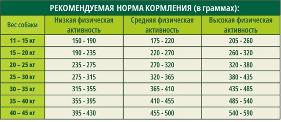 Указанные количества являются ориентировочными и могут отличаться от приведенных в таблице в зависимости от возраста, размера собаки и уровня ее физической активности.