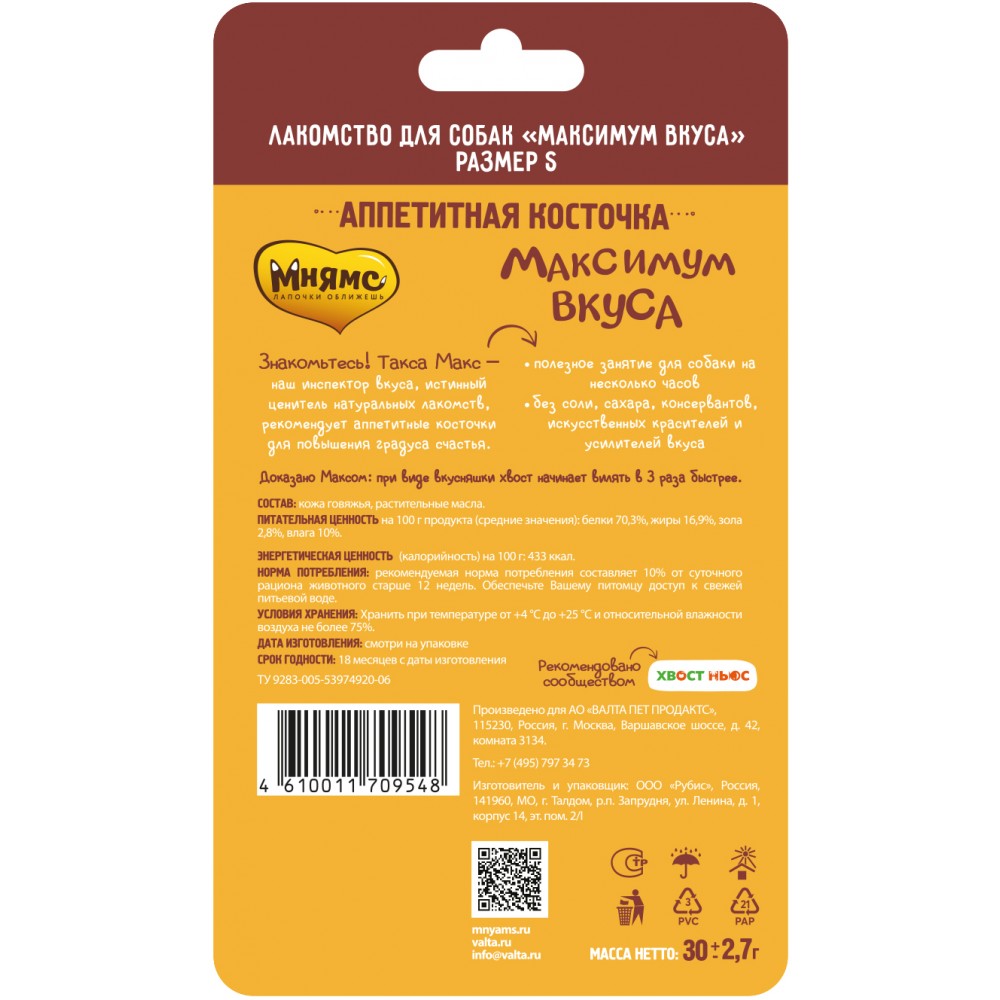 Такса Макс – наш инспектор вкуса, истинный ценитель натуральных лакомств, рекомендует аппетитные косточки для повышения градуса счастья.