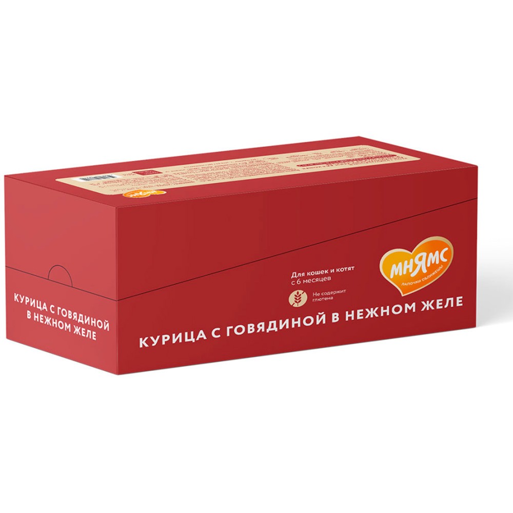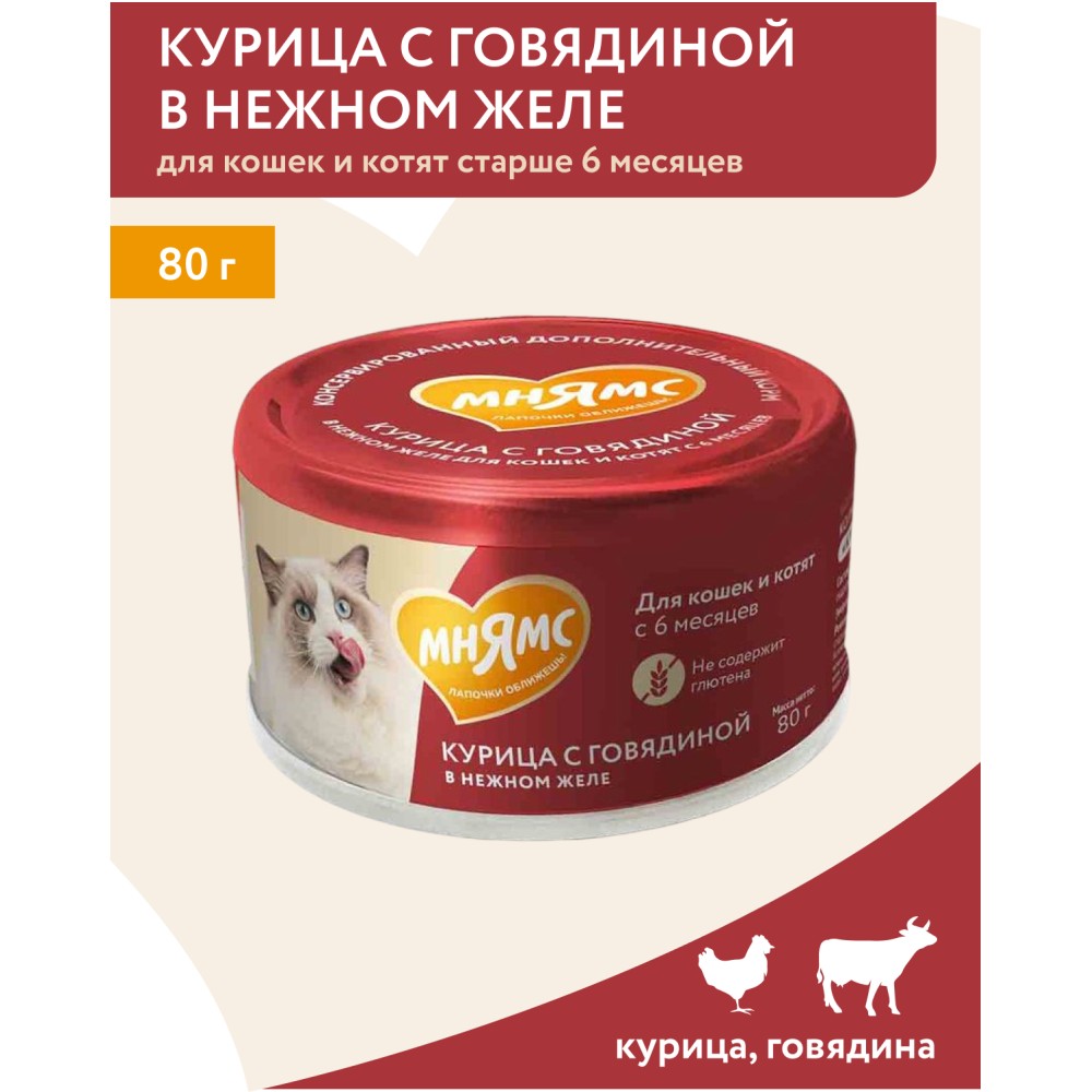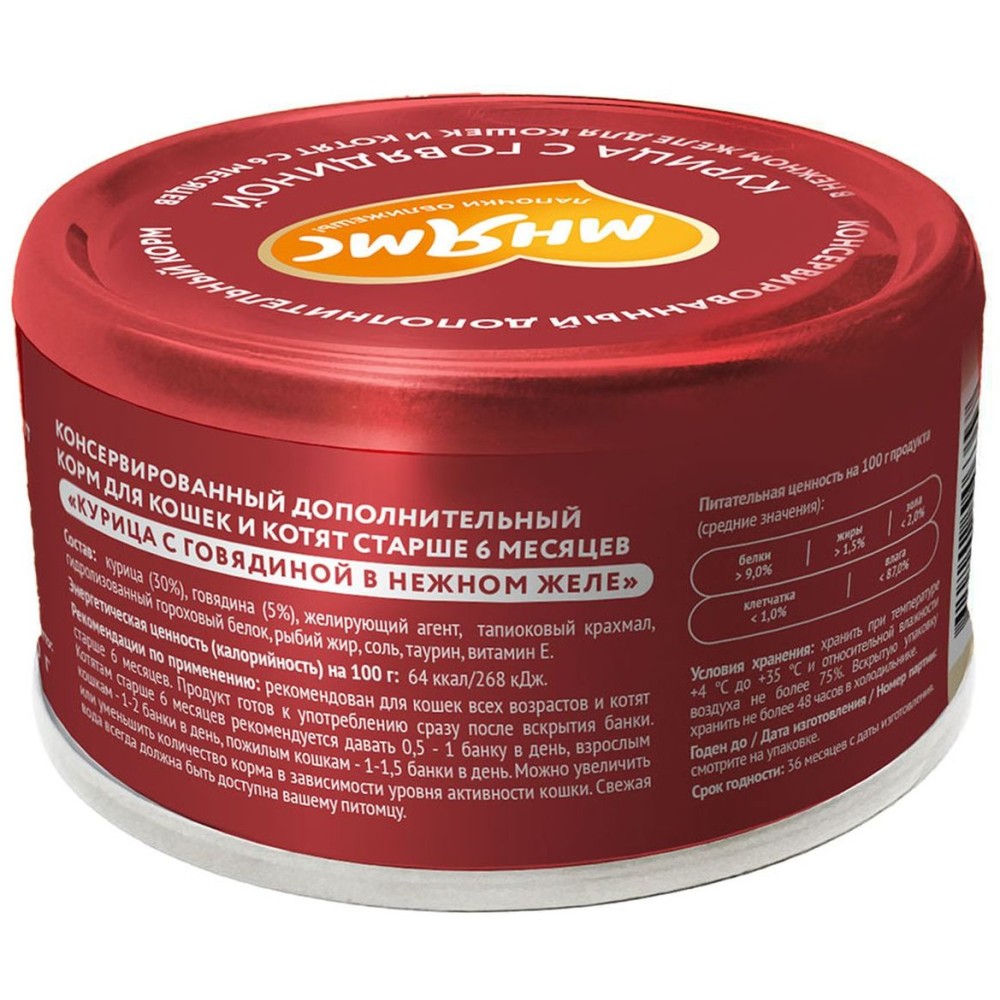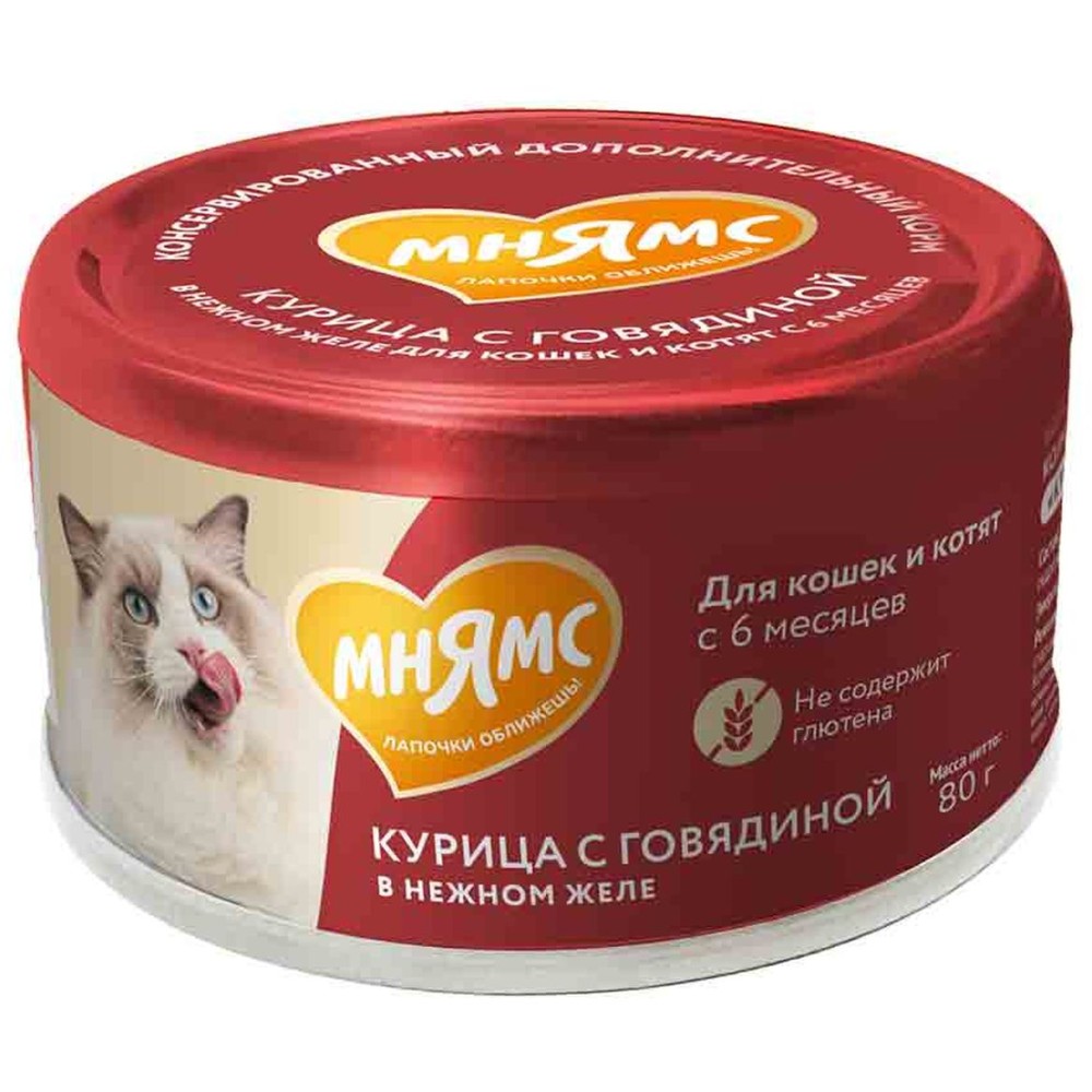 «Мнямс» консервированный дополнительный корм для для кошек и котят старше 6 месяцев «Курица в нежном желе" гарантирует, что ваш питомец получит только качественный и вкусный продукт, который прекрасно разнообразит его рацион, поддержит здоровье и обеспечит энергией.