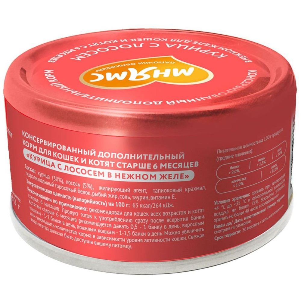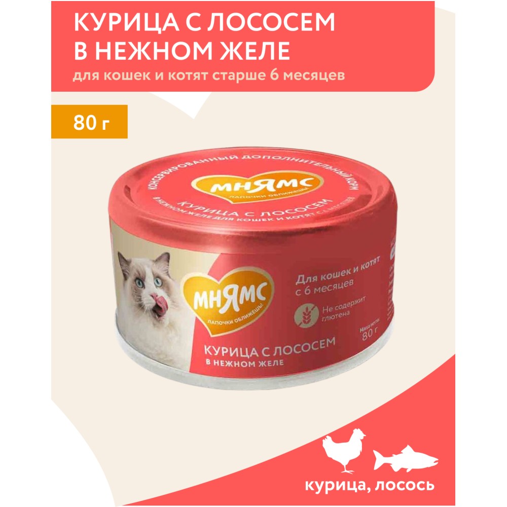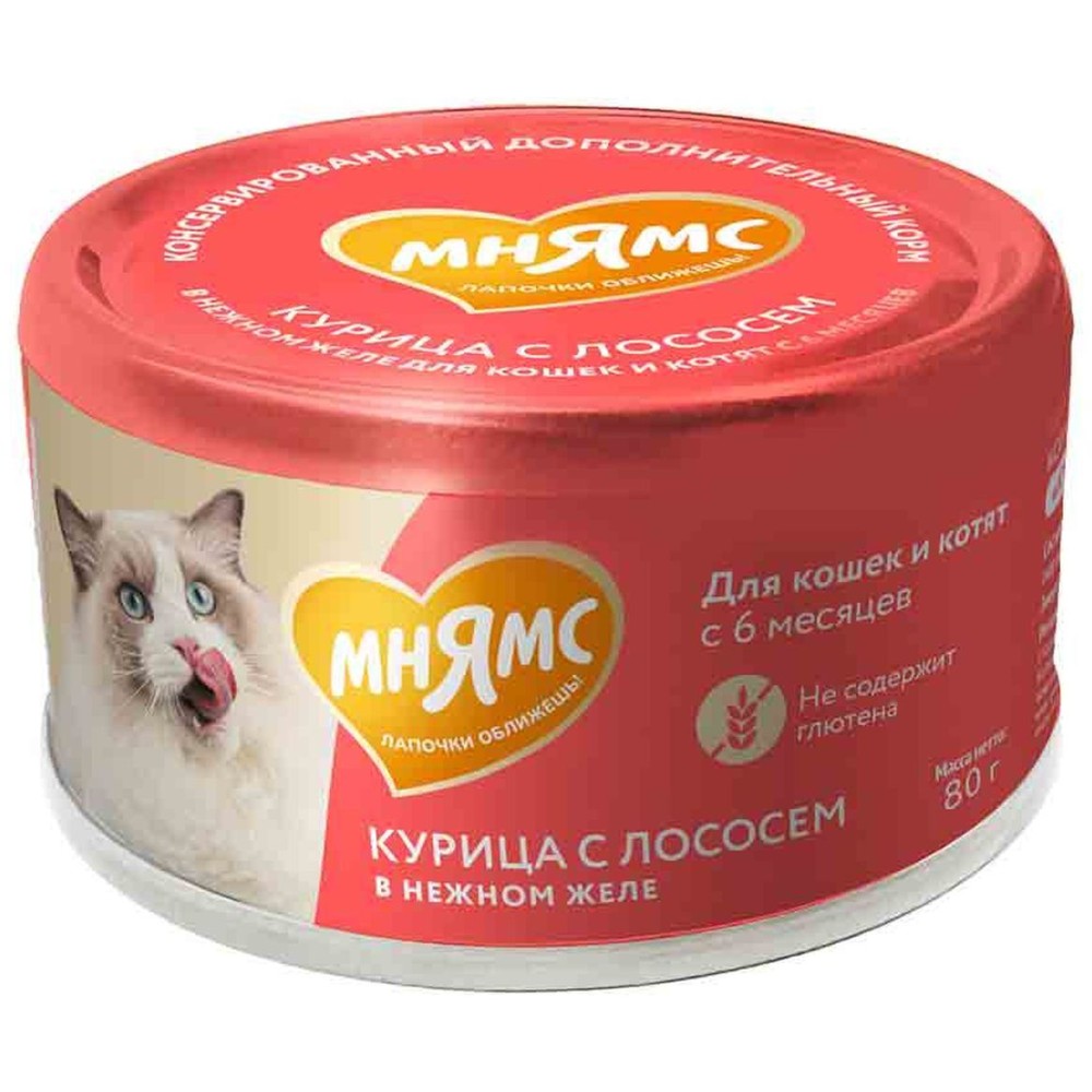 «Мнямс» консервированный дополнительный корм для для кошек и котят старше 6 месяцев «Курица в нежном желе" гарантирует, что ваш питомец получит только качественный и вкусный продукт, который прекрасно разнообразит его рацион, поддержит здоровье и обеспечит энергией.