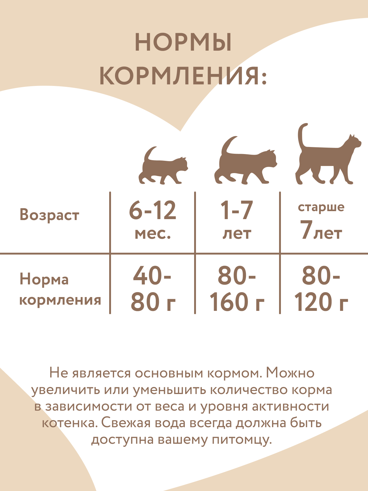 Котятам старше 6 месяцев рекомендуется давать - 40-80 г в день, взрослым кошкам - 80-160 г в день, пожилым кошкам - 80-120 г в день.