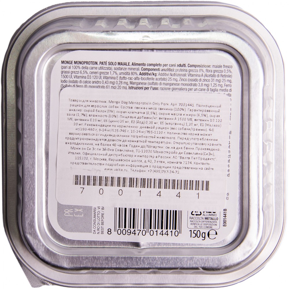 Полноценный монобелковый рацион для взрослых собак Monge (Монж/Монже) Dog Monoprotein (Монопротеин) Solo (Соло) паштет из свинины 150 г