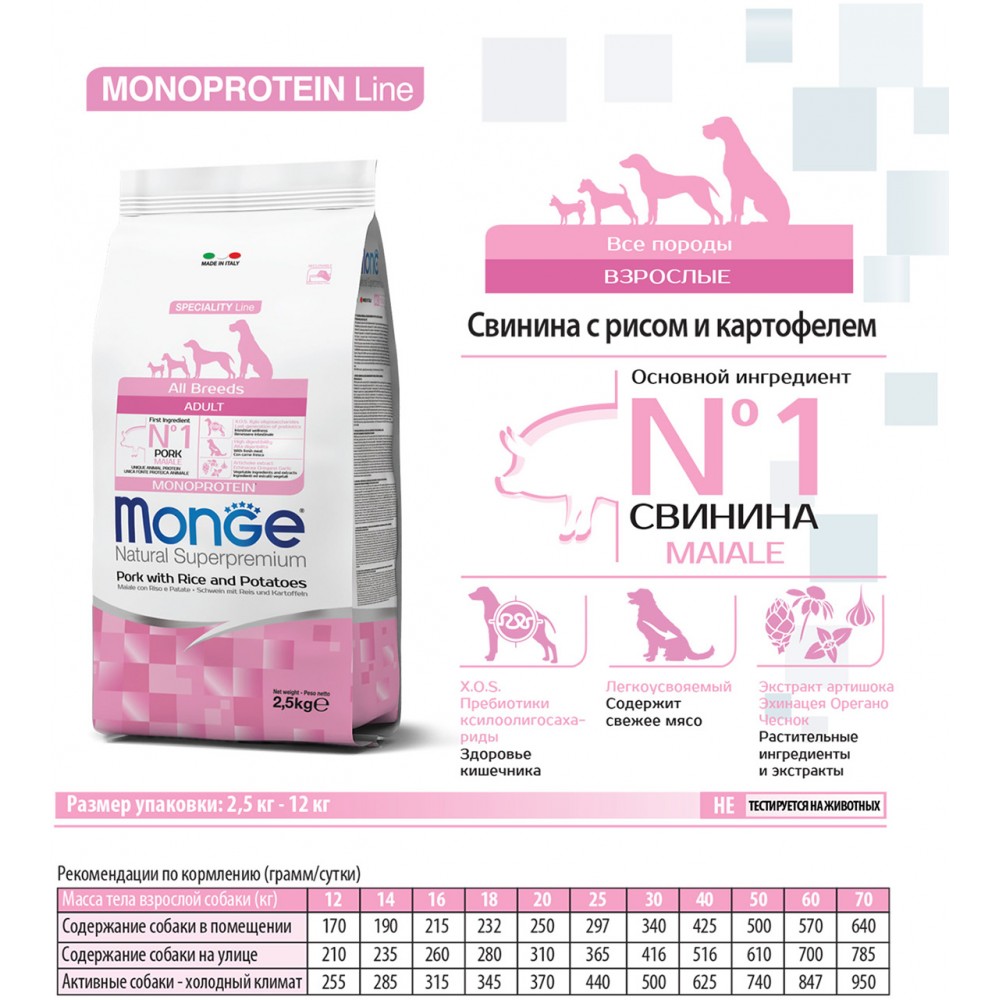 Monge (Монж/Монже) Dog Monoprotein (Монопротеин) корм для собак всех пород свинина с рисом и картофелем 12 кг.