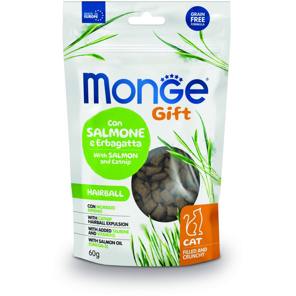 Лакомство MONGE GIFT HAIRBALL для кошек "Хрустящие подушечки с начинкой" с лососем и кошачьей мятой для вывода шерсти 60 г.