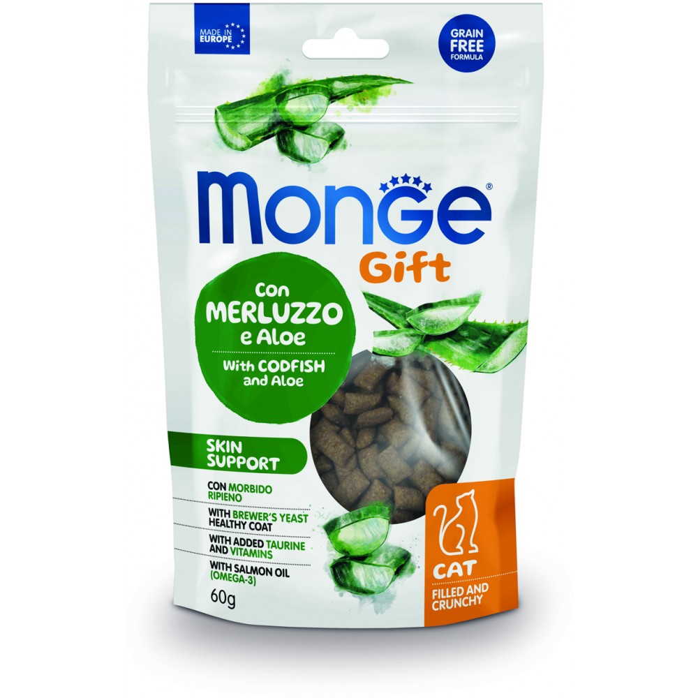 Лакомство MONGE GIFT SKIN SUPPORT для кошек "Хрустящие подушечки с начинкой" с треской и алоэ вера для здоровой кожи 60 г.
