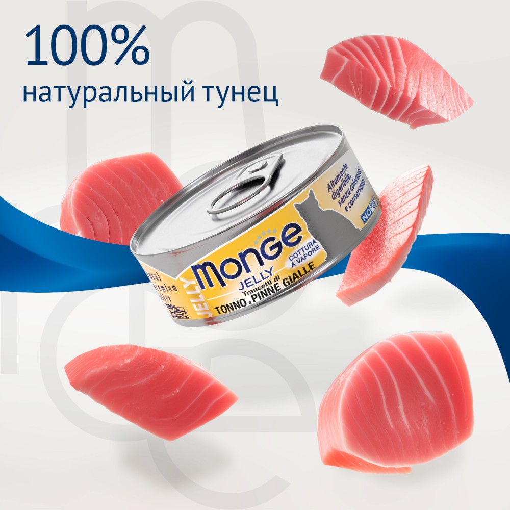Дополнительное питание Monge Jelly для взрослых кошек, консервы из кусочков свежего тунца в аппетитном желе.