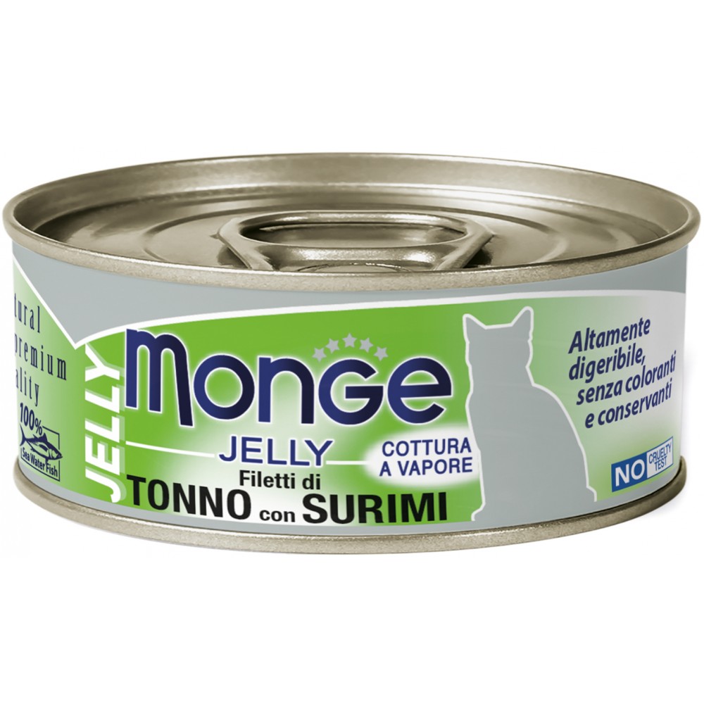 Влажный корм Monge jelly Adult cat для взрослых кошек с желтоперым тунцом и сурими, консервы 80 г.