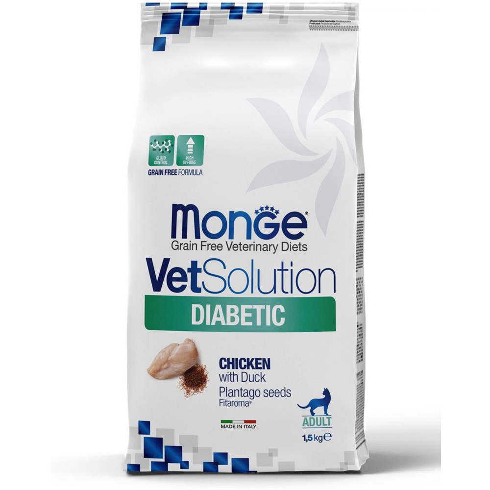 Monge (Монж/Монже) VetSolution Diabetic — полнорационный сухой диетический корм из курицы для кошек «Diabetic» для контроля поступления глюкозы (при сахарном диабете) у кошек.