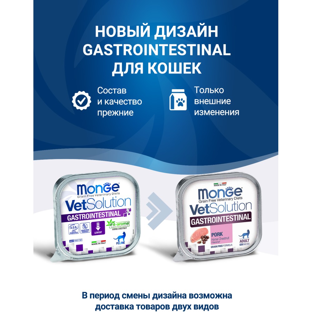 Лечебный корм Monge (Монж/Монже) VetSolution Cat Gastrointestinal Гастро интестинал для кошек при заболеваниях желудочно-кишечного тракта, таких как гастрит, колит, острый и хронический гастроэнтерит, диарея и избыточный бактериальный рост в тонком отделе кишечника