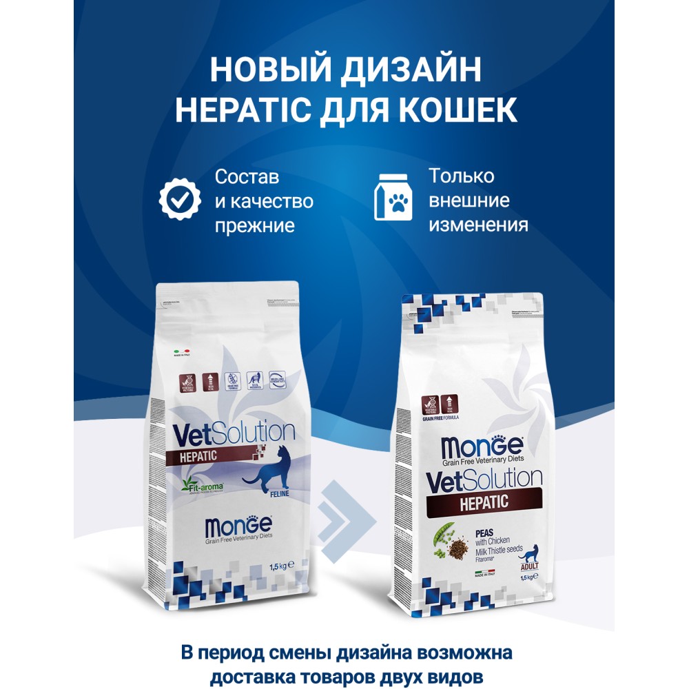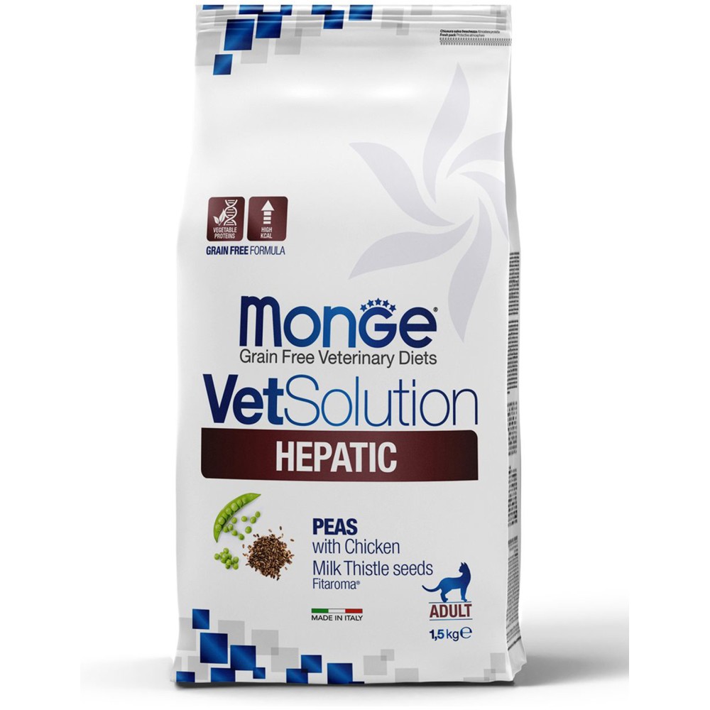 Лечебный корм Monge (Монж/Монже) VetSolution Cat Hepatic для кошек Гепатик при заболеваниях печени, таких как печеночная недостаточность, хронический гепатит, фиброз печени, нарушение метаболизма меди, печеночная энцефалопатия, пироплазмоз и желтуха 1,5 кг