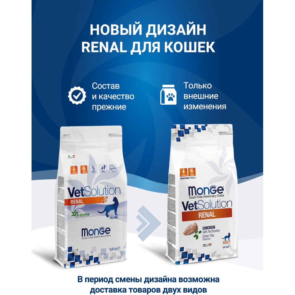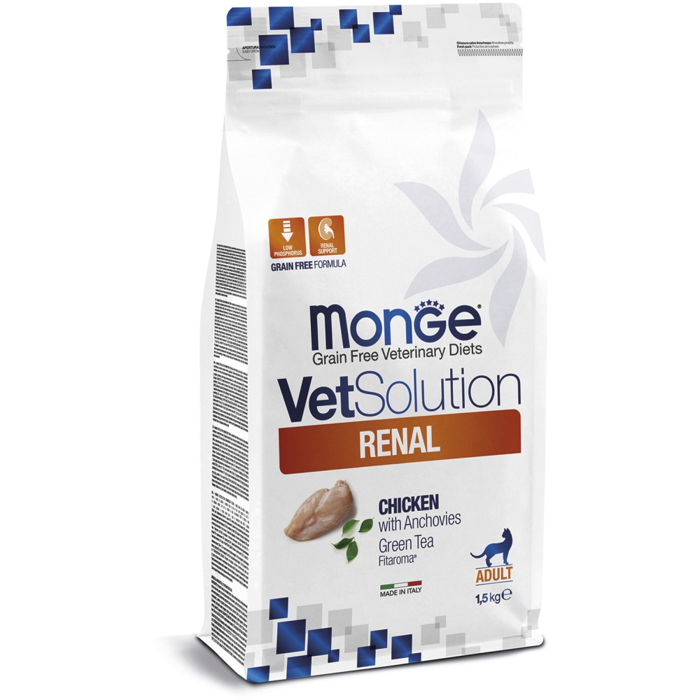 Лечебный корм Monge (Монж/Монже) VetSolution Cat Renal для кошек при заболеваниях почек, таких как хроническая почечная недостаточность, анорексия, недостаточность питания, метаболический ацидоз 1,5 кг
