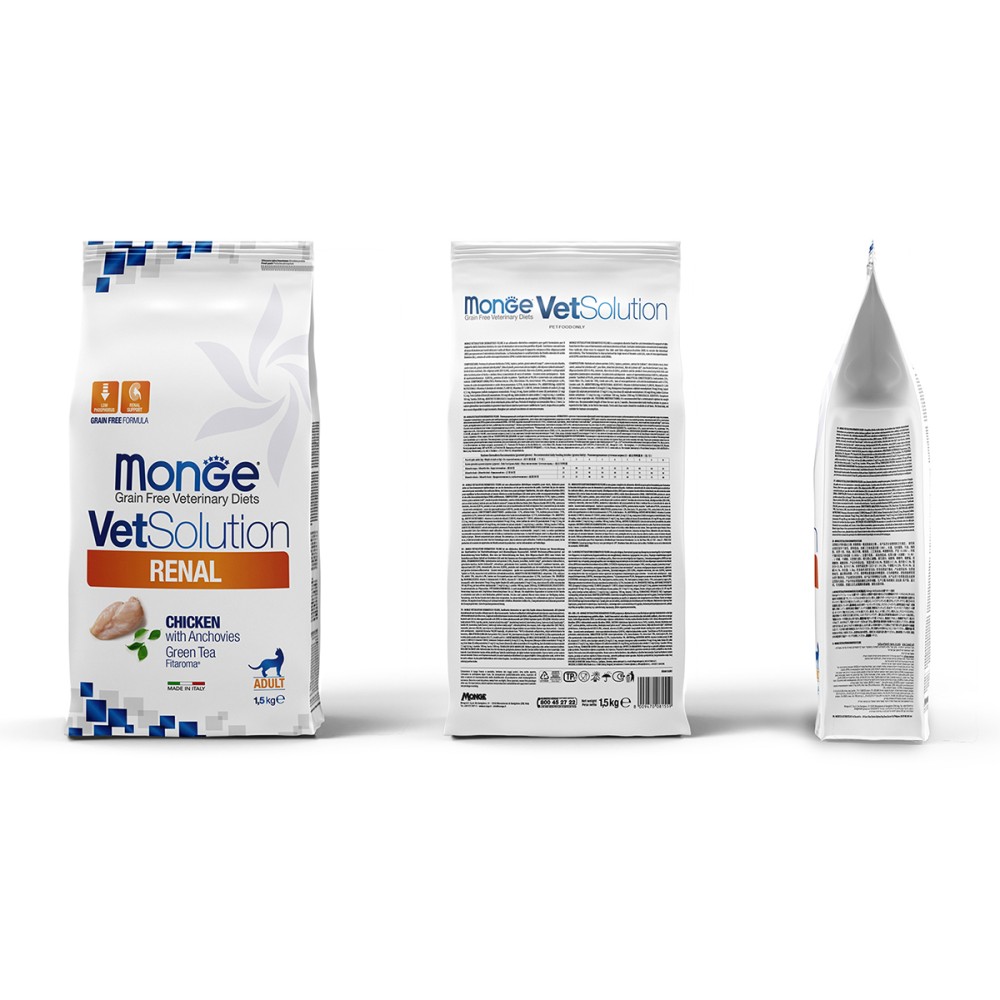 Monge (Монж/Монже) VetSolution Renal — полнорационный диетический корм для поддержания функции почек у кошек при острой или хронической почечной недостаточности.