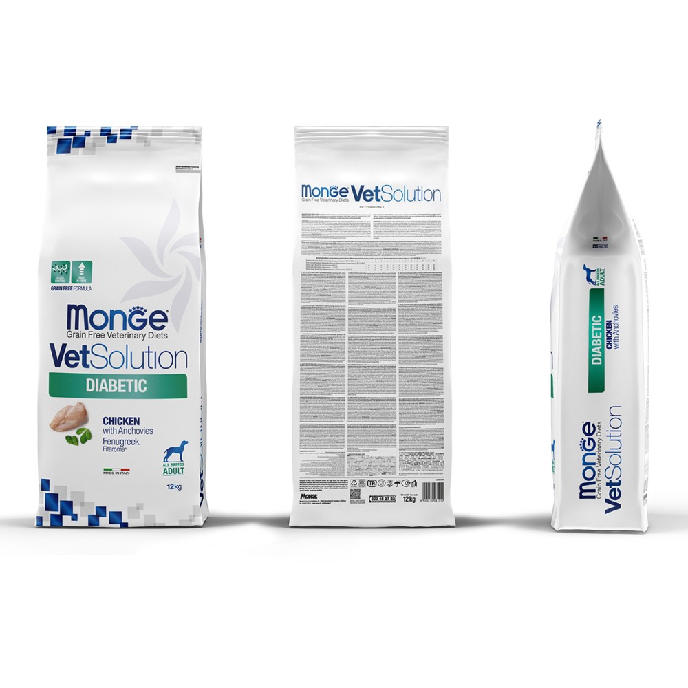 Monge (Монж/Монже) VetSolution Diabetic Canine — полнорационный сухой диетический корм из курицы для собак «Diabetic» для контроля поступления глюкозы (при сахарном диабете) у собак.