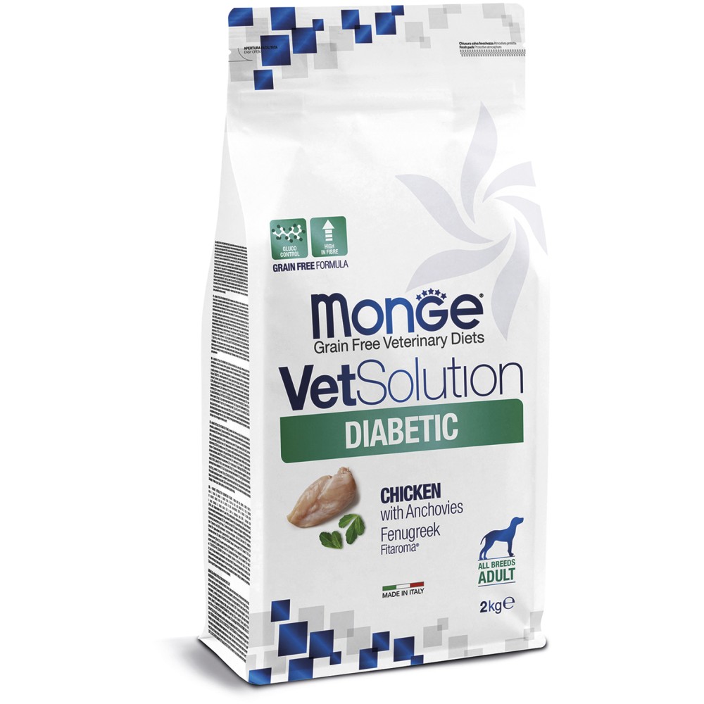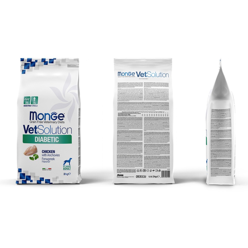 Monge (Монж/Монже) VetSolution Diabetic Canine — полнорационный сухой диетический корм из курицы для собак «Diabetic» для контроля поступления глюкозы (при сахарном диабете) у собак.