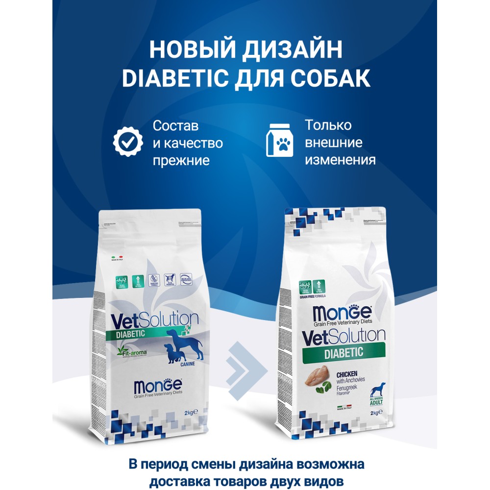 Лечебный корм Monge (Монж/Монже) VetSolution Dog Diabetic для собак при сахарном диабете, гипергликемии, избыточном весе 2 кг