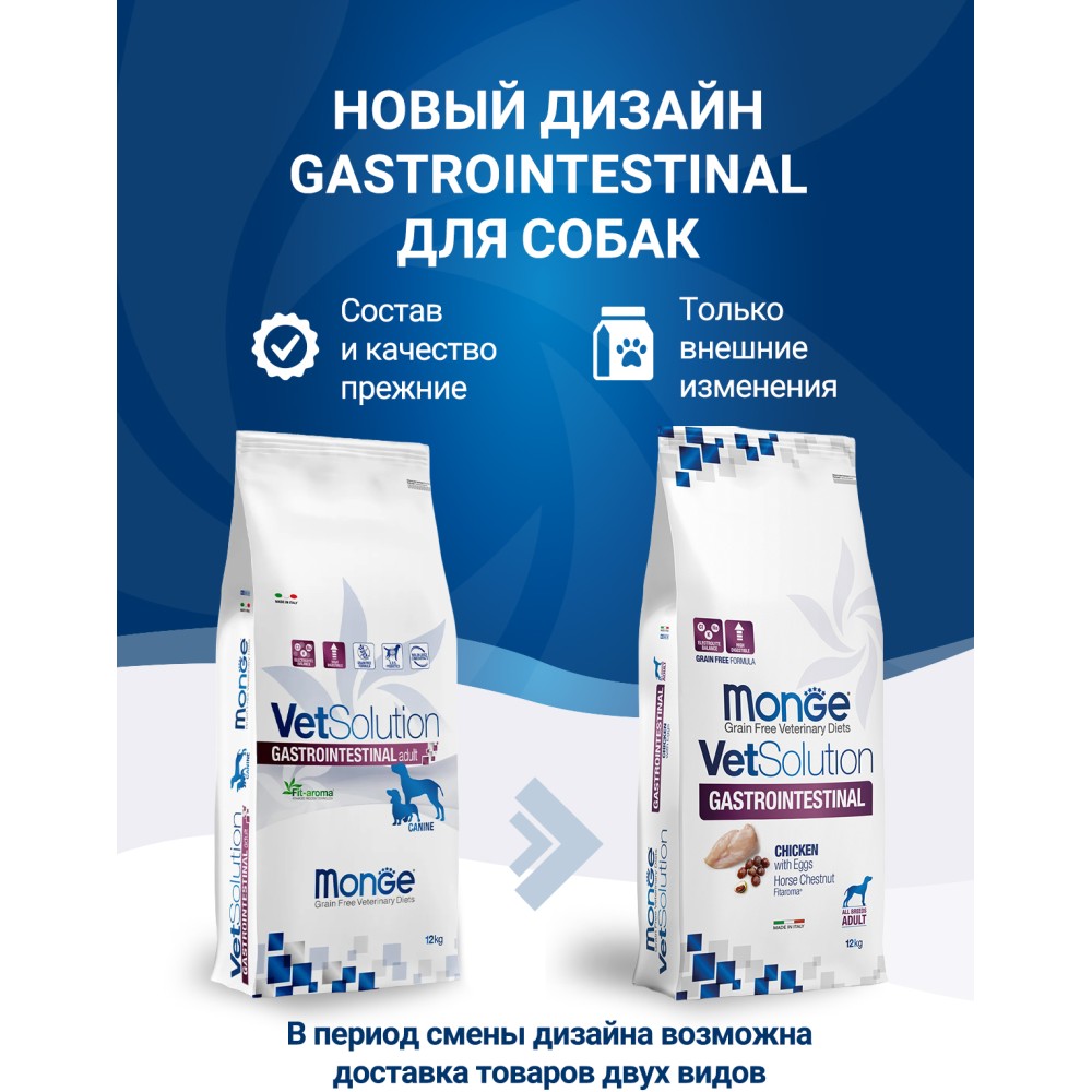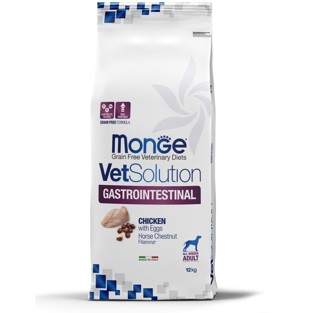 Лечебный корм Monge VetSolution Dog Gastrointestinal для собак Гастроинтестинал при заболеваниях желудочно-кишечного тракта, таких как острый и хронический гастрит, расстройства моторики желудка энтерит и воспалительные заболевания кишечника, энтеропатии с потерей белка, синдром короткой кишки и избыточный бактериальный рост в тонком отделе кишечника, колит, а так же при остром и хроническом панкреатите (для собак, НЕ страдающих ожирением и гипертриглицеридемией) 12 кг.