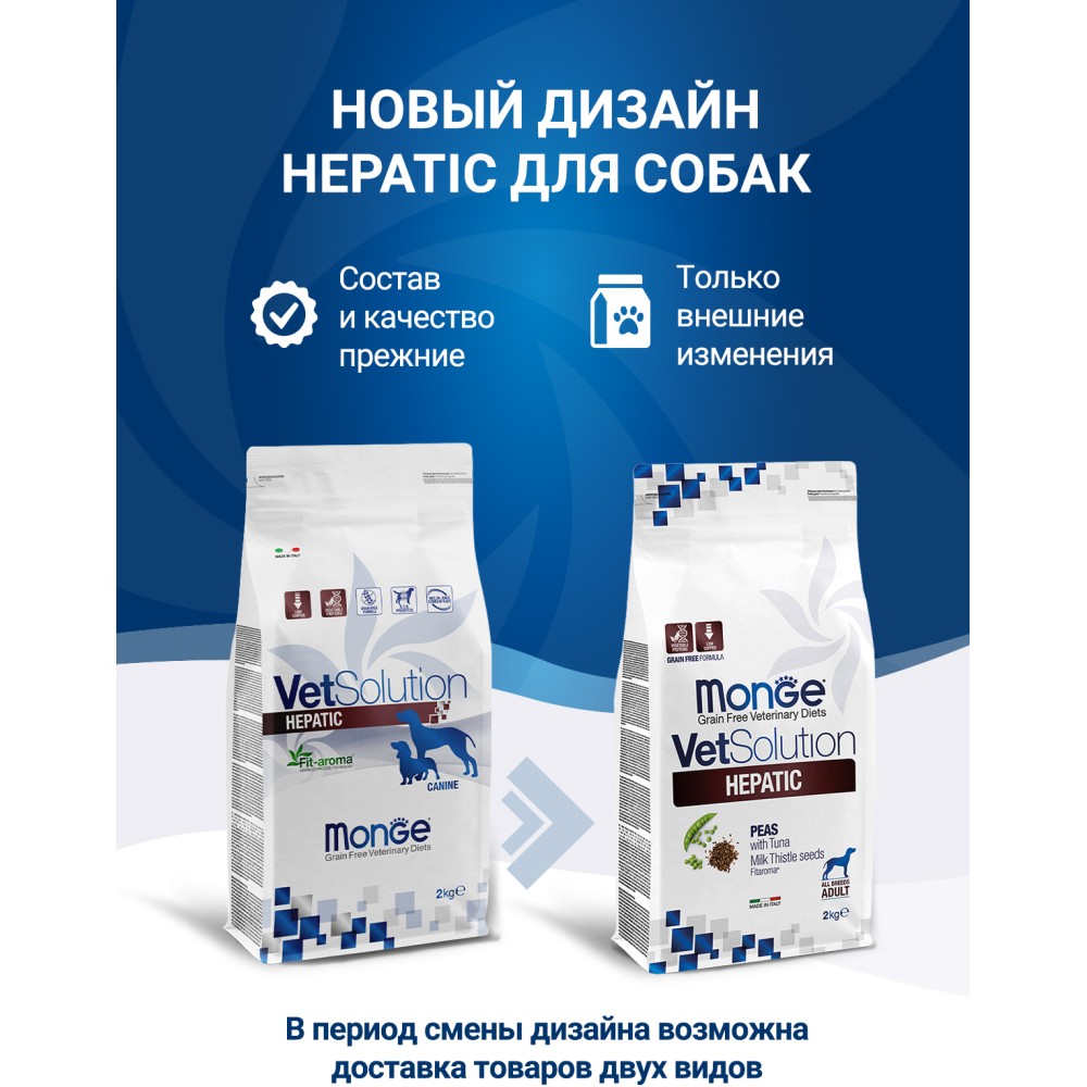 Лечебный корм Monge (Монж/Монже) VetSolution Dog Hepatic для собак при заболеваниях печени, таких как печеночная недостаточность, хронический гепатит, фиброз печени, нарушение метаболизма меди при печеночной энцефалопатии, пироплазмоз, желтуха 2 кг
