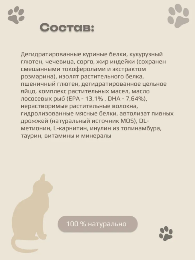 Формула содержит все необходимые витамины и минералы для поддержания общего здоровья кошки.
