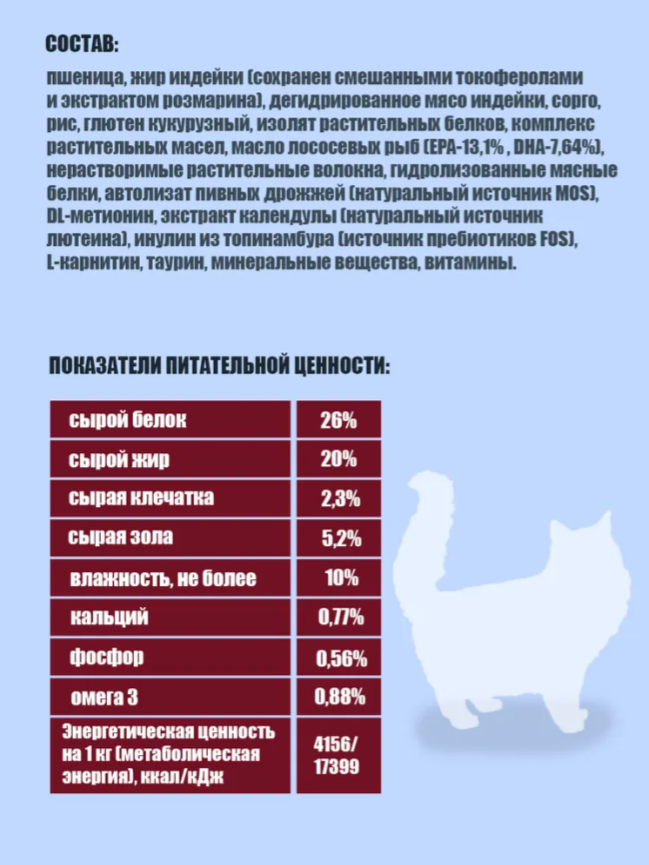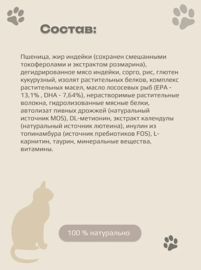 Формула разработана на основе легкоусвояемых белков животного происхождения — дегидрированного мяса индейки — и тщательно подобранных источников углеводов: пшеницы, риса, сорго.