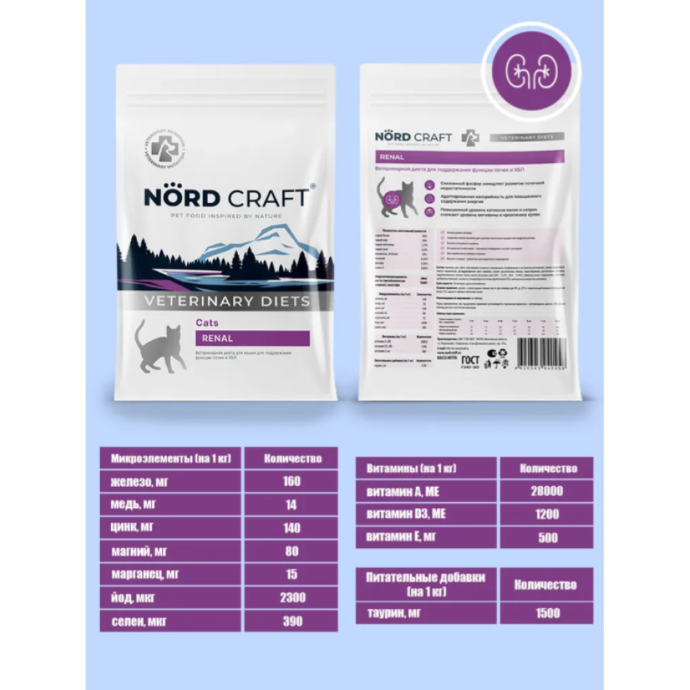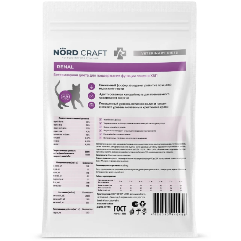 Nord Craft Renal – сухой корм супер-премиум класса для кошек с хронической болезнью почек (ХБП).
