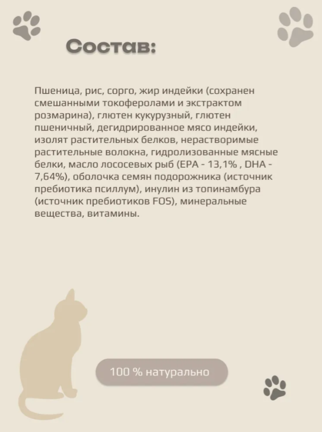 Корм разработан на основе натурального мяса индейки и содержит злаки (пшеница, рис, сорго), обеспечивая высокую питательную ценность и приятный вкус.