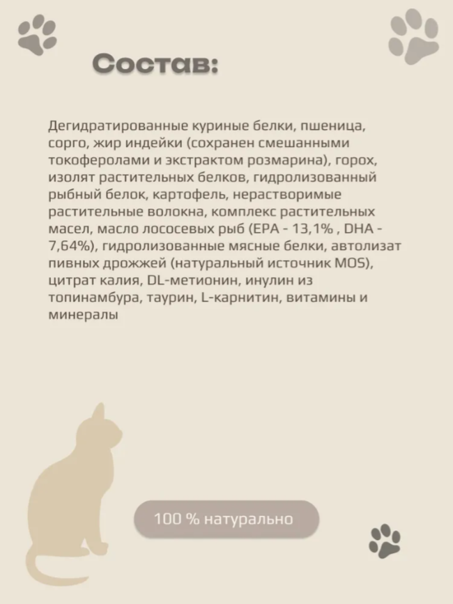В состав входят высококачественные дегидратированные куриные белки и мясо индейки, что обеспечивает оптимальное содержание белка и высокую вкусовую привлекательность.