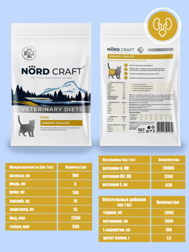 Далее Nord Craft Urinary Oxalate — сухой корм супер-премиум класса, созданный специально для взрослых кошек с мочекаменной болезнью оксалатного типа.