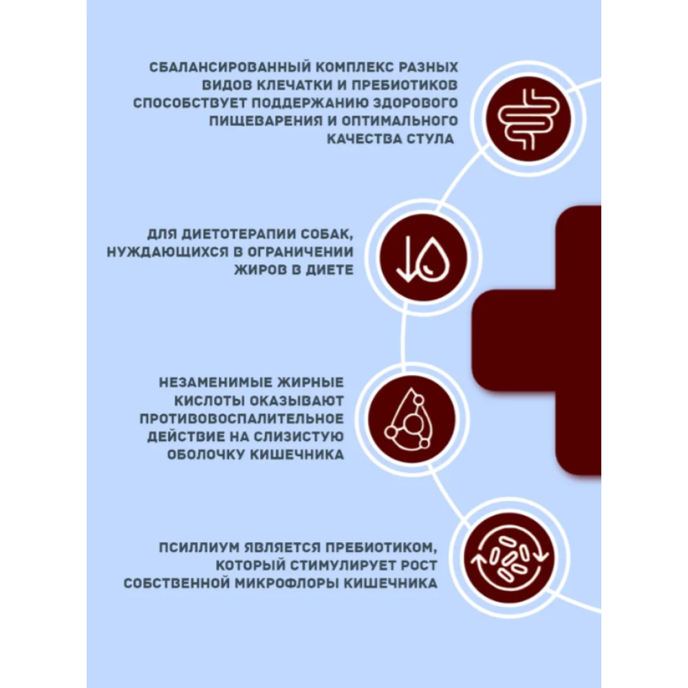 Подходит для животных с чувствительным пищеварением, нарушениями стула, панкреатитом и гастритом.